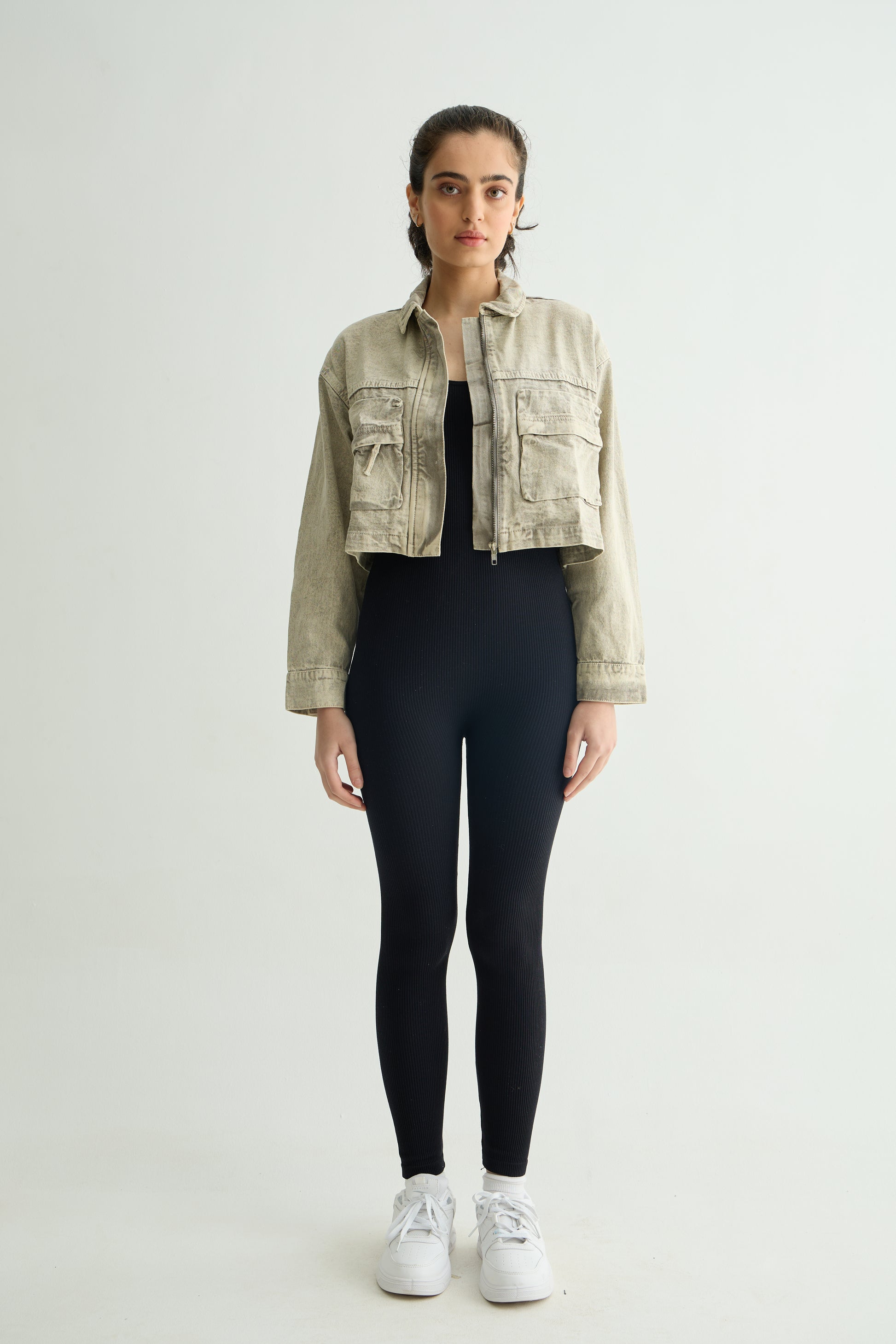 Cropped denim jacket crafted from mid-weight cotton denim with a soft sand-washed finish. Designed with utility-style flap pockets, a front zip closure, and snap-button cuffs for a structured yet relaxed silhouette. The washed beige tone gives it a timeless, lived-in feel.